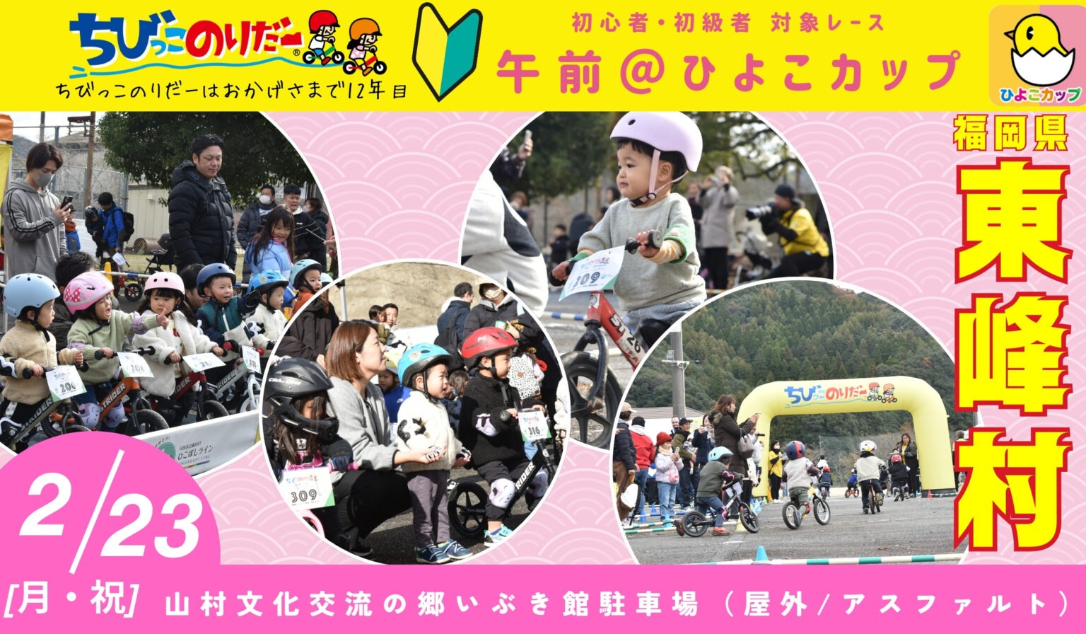 大会概要大会名:ちびっこのりだーひよこカップ@東峰村 開催日:2026年2月23日 開催場所:山村文化交流の郷 いぶき館駐車場 参加年齢/クラス:2歳以下も出場可 | 2歳クラス | 3歳クラス | 4歳クラス | 5歳クラス | 6歳クラス 参加費:2,000円〜 エントリー期日:2026年1月3日~2026年2月23日まで エントリーについて:入金確認でエントリー完了 |